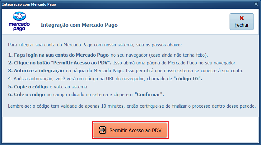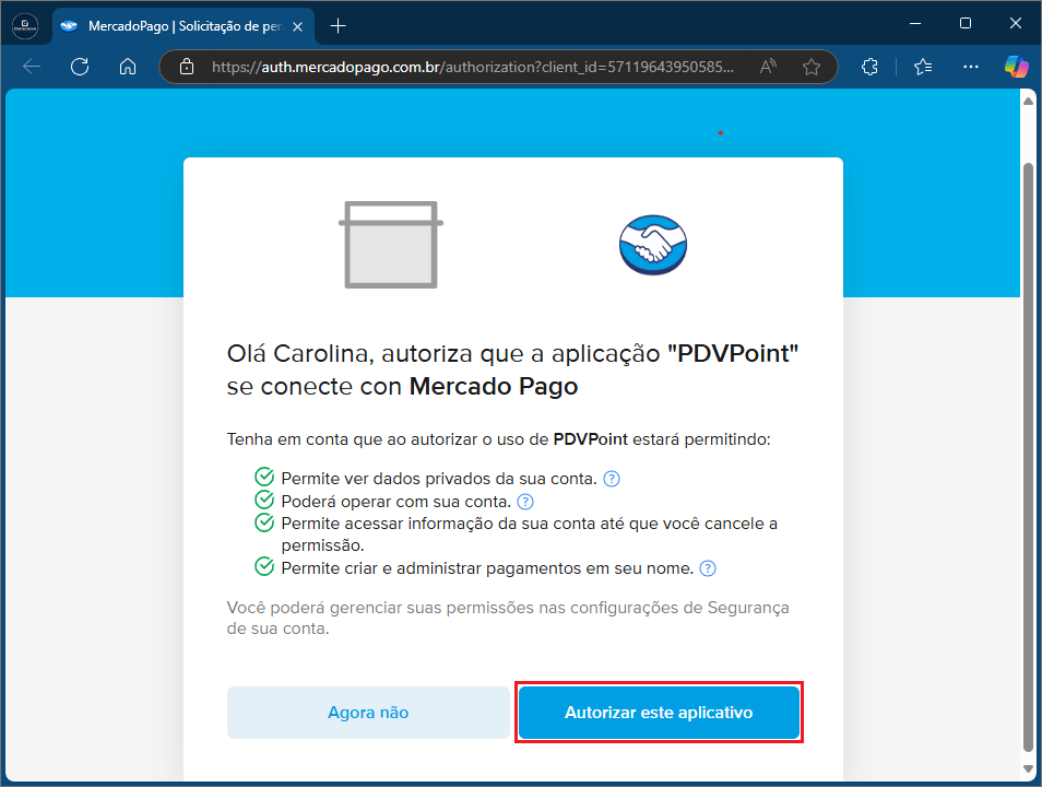 19- Aguarde para ser direcionado ao site do Mercado Pago para autorizar a conexão.