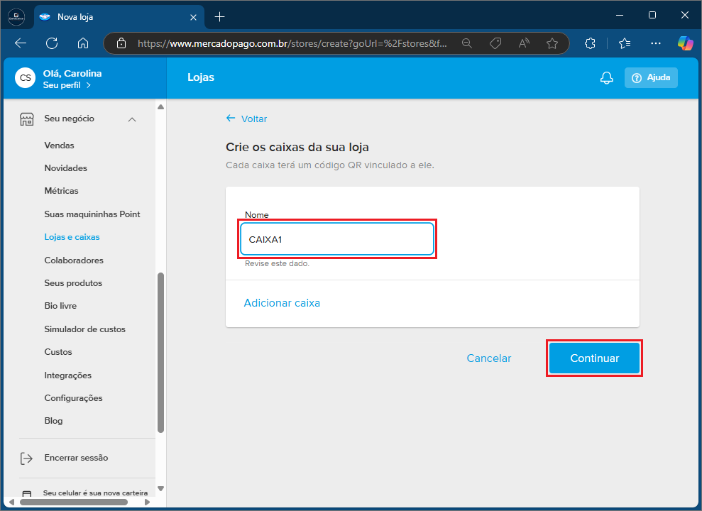 5- Informe o nome do caixa, sem espaçamento entre as letras. Logo após, clique em Continuar.