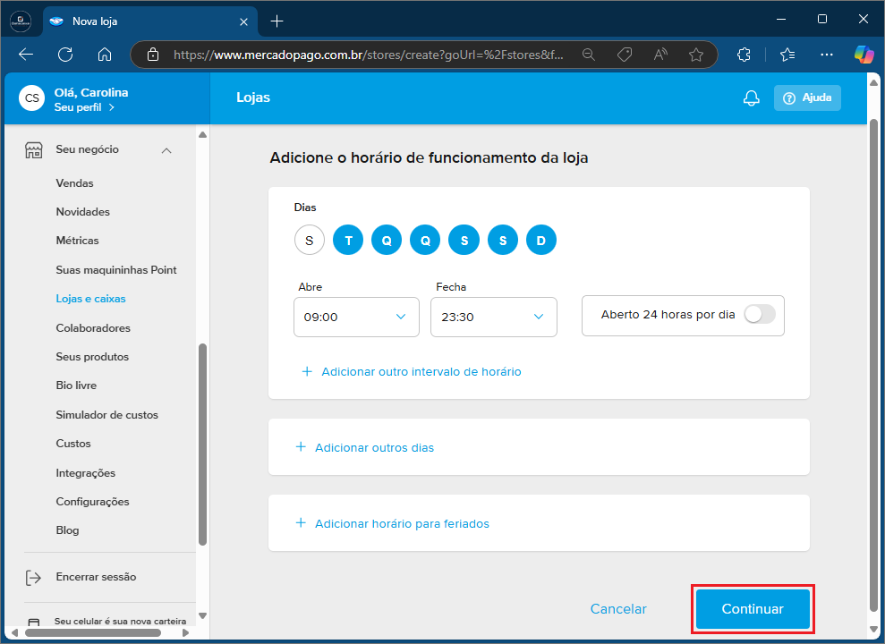 4- Adicione o horário de funcionamento da loja. Em seguida, clique em Continuar.