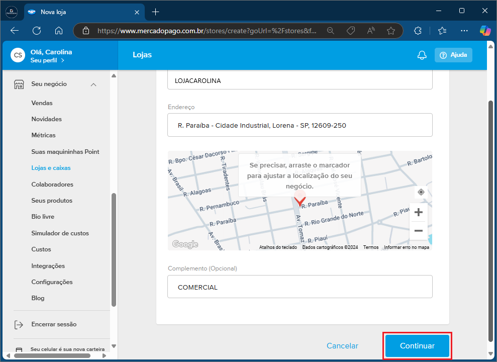3- Informe um nome para sua Loja, sem espaçamento entre as letras, e o endereço do seu negócio. Logo após, clique em Continuar.
