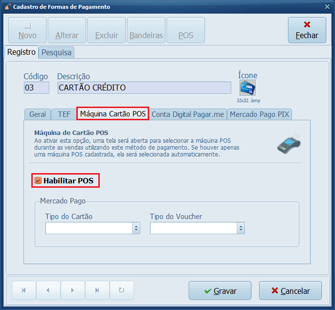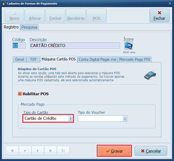 35- Em Tipo do Cartão, selecione Cartão de Crédito. Em seguida, clique em Gravar.
