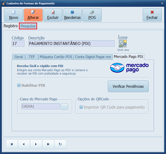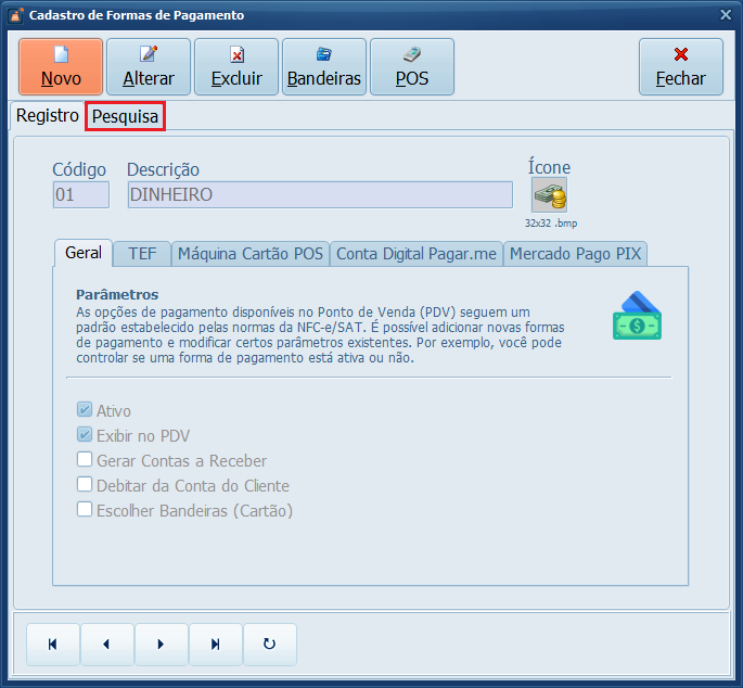 32- Acesse o Menu Gerencial > Formas de Pagamento. Em seguida, clique em Pesquisa.