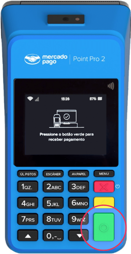 3- Na maquininha, pressione o botão verde para receber o pagamento. Em seguida, insira ou aproxime o cartão.