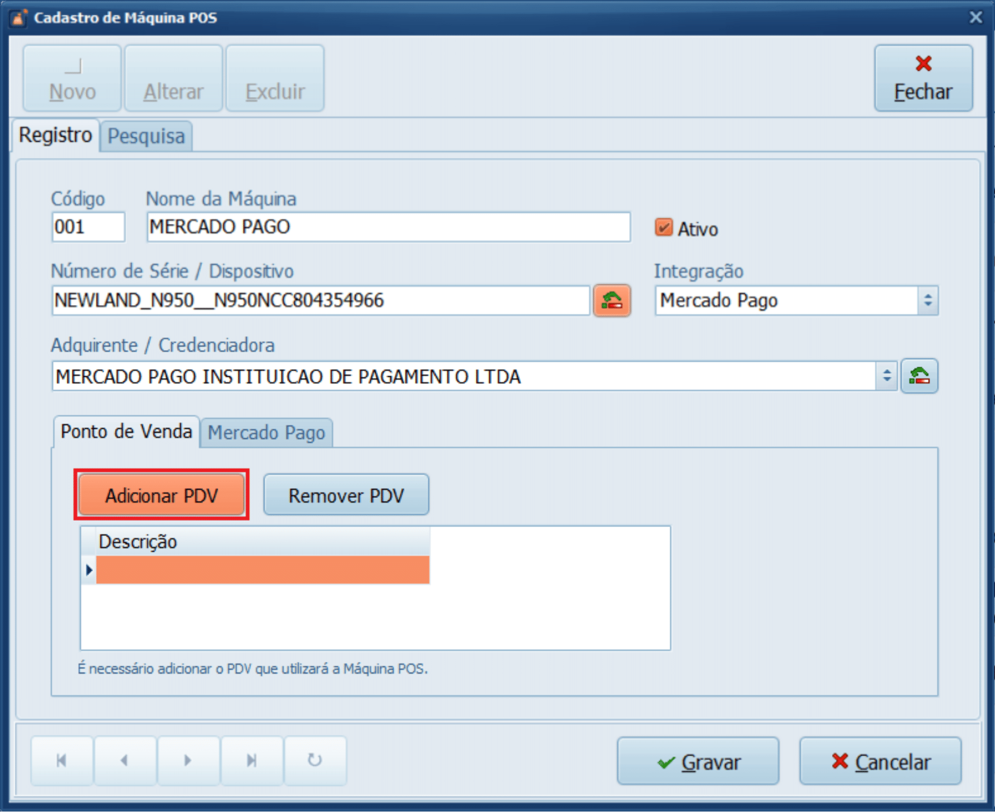 25- Dê um duplo clique para adicionar o PDV que usará a maquininha do Mercado Pago. Você pode adicionar mais de um PDV, se desejar.