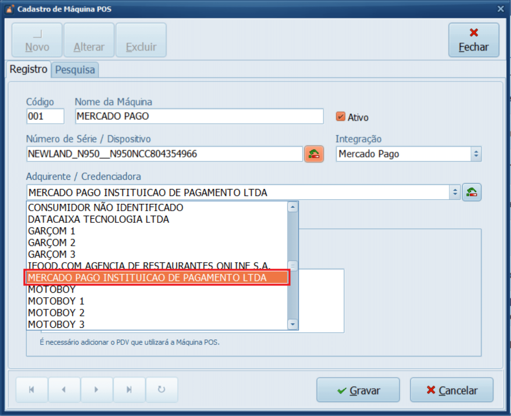 23- Em Adquirente / Credenciadora, selecione o cadastro do MERCADO PAGO INSTITUIÇÃO DE PAGAMENTO LTDA.