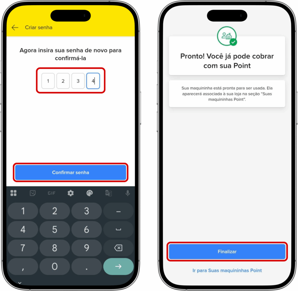 11- Insira novamente a senha criada > Confirmar senha. Depois, toque em Finalizar.