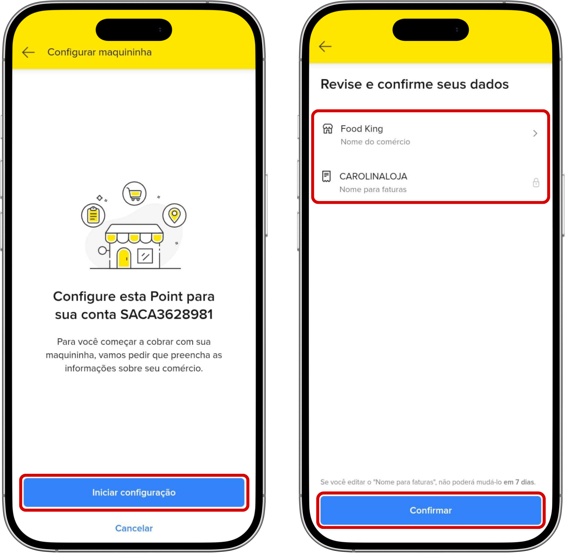 8- Toque em Iniciar configuração. Em seguida, confirme o Nome do comércio e o Nome para faturas > Continuar.