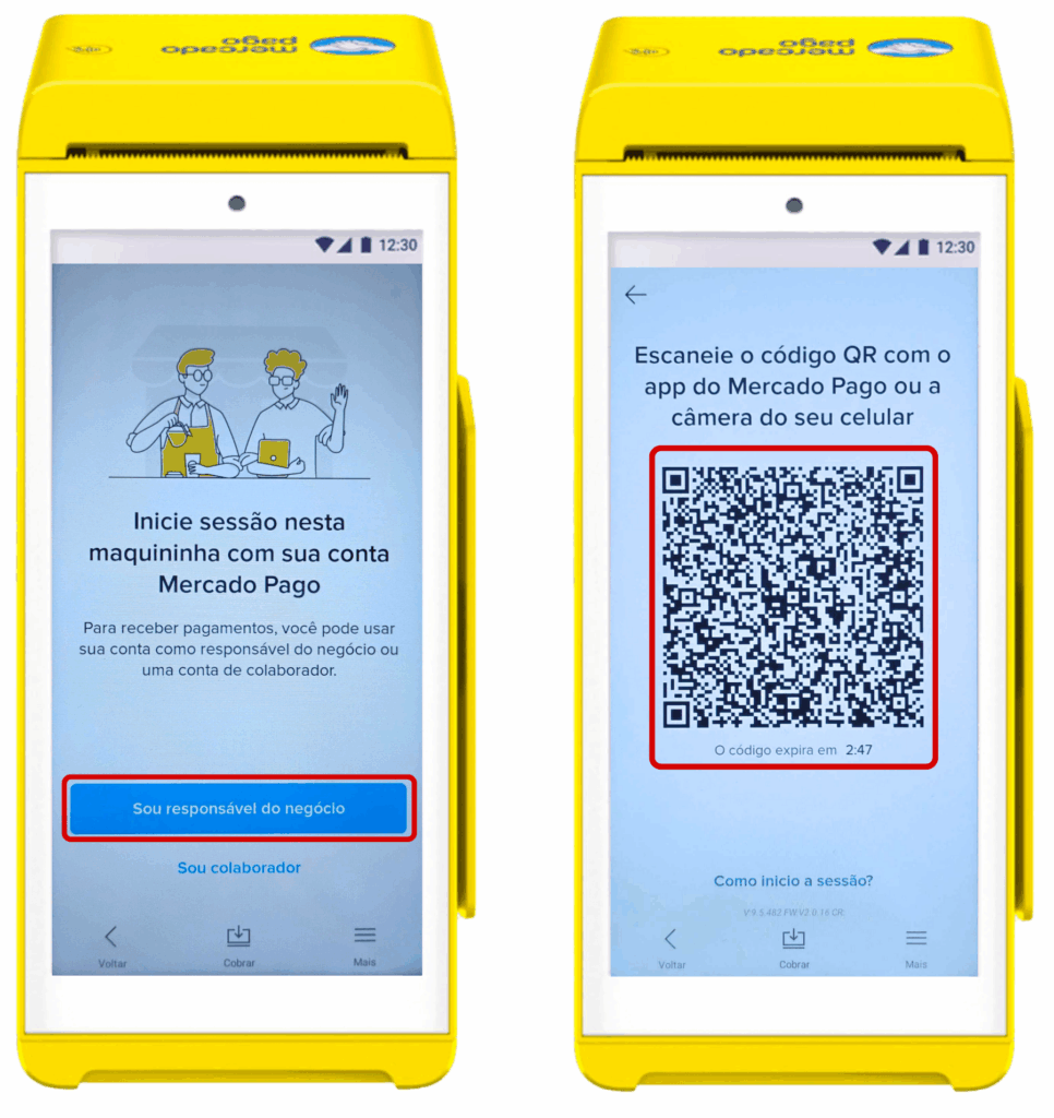 6- Na sua maquininha, toque em Sou responsável do negócio e aguarde o QR Code ser exibido na tela.