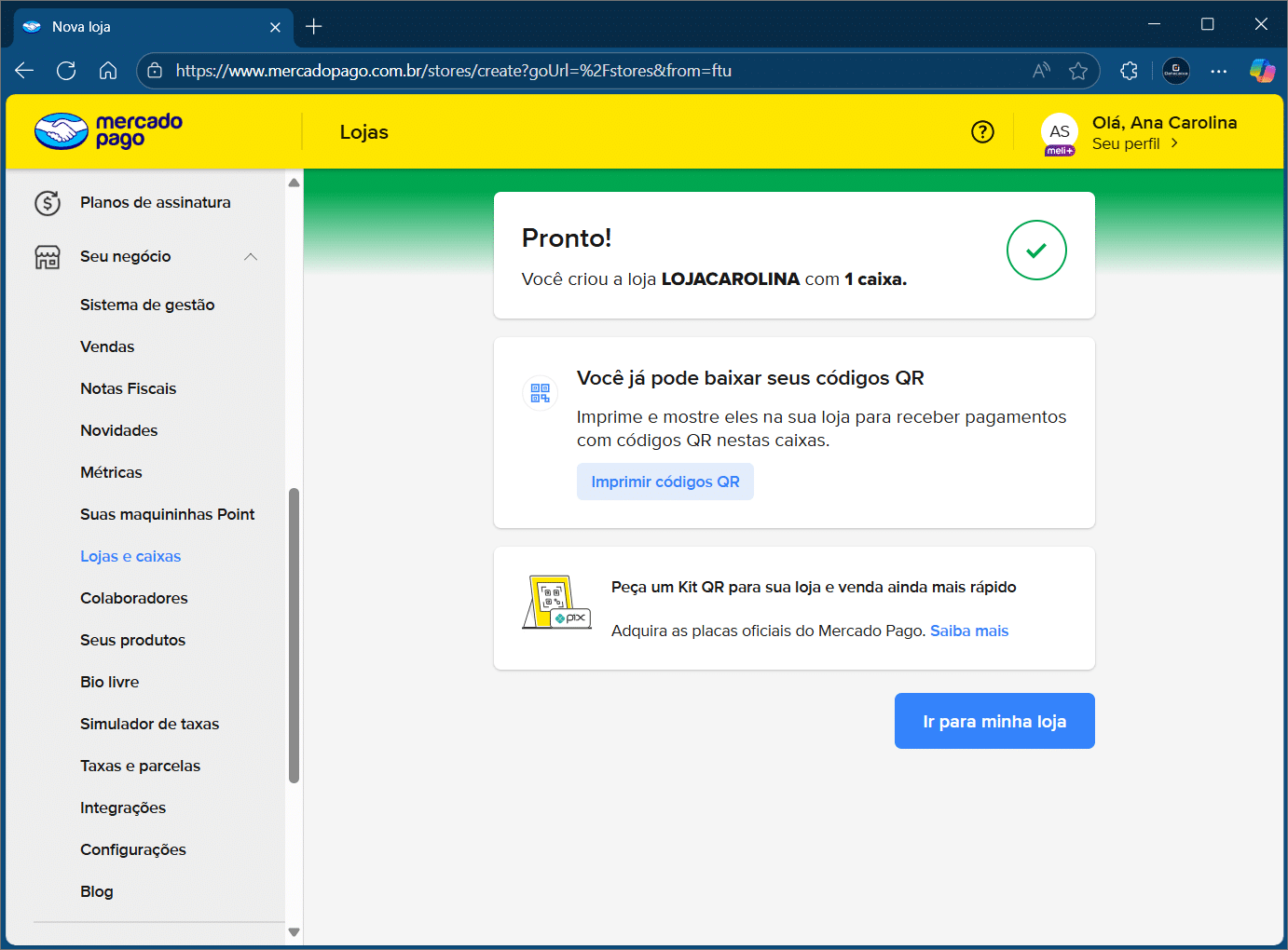 Pronto! Você realizou o cadastro da sua loja e do caixa.