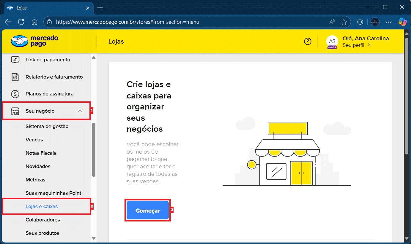 2- No menu lateral, clique em Seu negócio > Lojas e caixas > Começar.