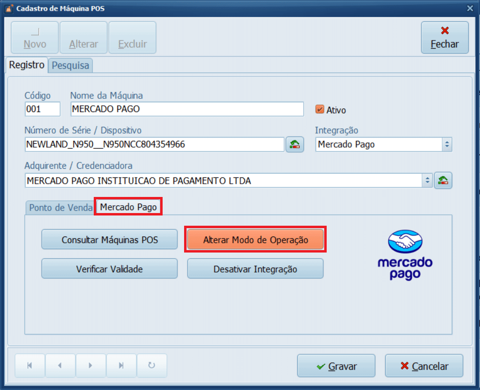 26- Clique em Mercado Pago. Em seguida, clique em Alterar Modo de Operação.