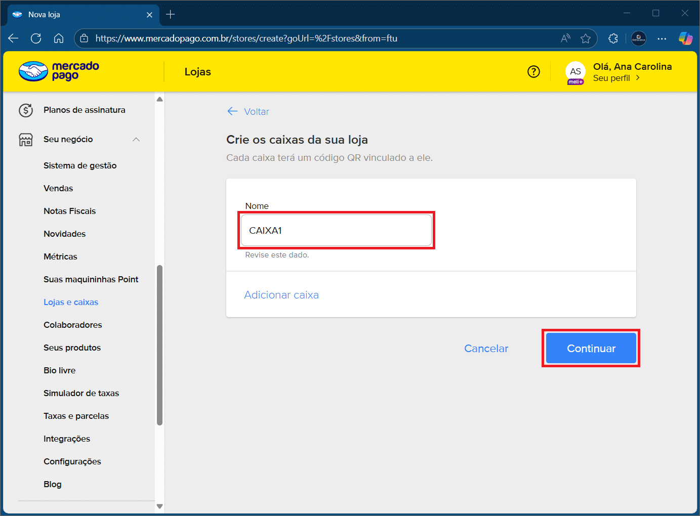 5- Informe o nome do caixa, sem espaçamento entre as letras > Continuar.