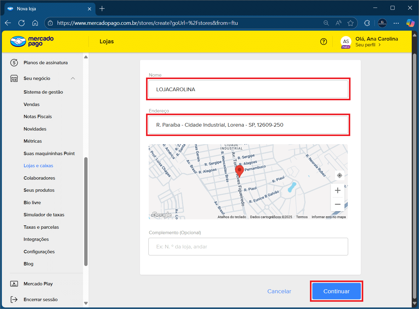 3- Informe um nome para sua Loja, sem espaçamento entre as letras, e o endereço do seu negócio > Continuar.