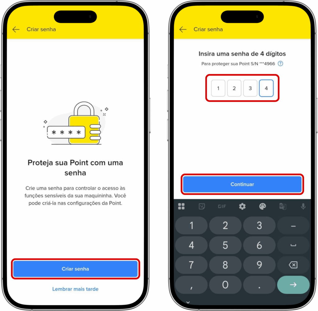 10- Toque em Criar senha e insira uma senha de 4 dígitos > Continuar.