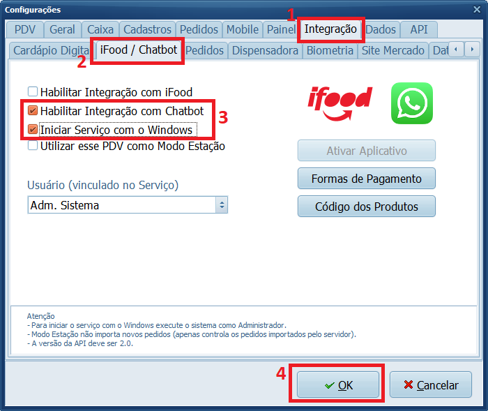 3- Clique em Integração > iFood/Chatbot > Habilite os campos de Integração e Serviço > Clique em Ok.