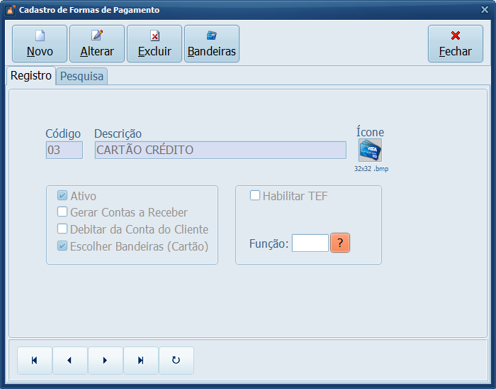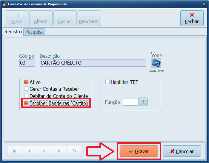 Agora vamos habilitar na forma de pagamento Cartão a escolha das bandeiras para que seja possível o controle das taxas.