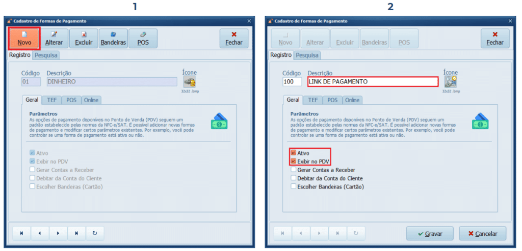 17- Clique em Novo. Preencha a Descrição como Link de Pagamento e mantenha selecionado os parâmetros Ativo e Exibir no PDV.