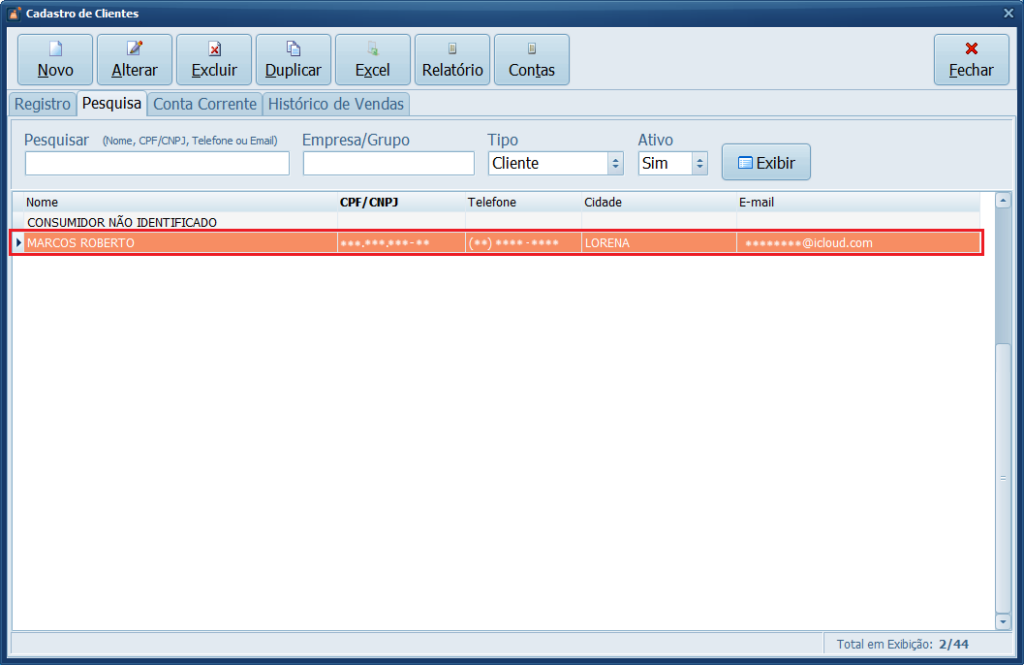 10- Clique duas vezes no cadastro do cliente para selecioná-lo.