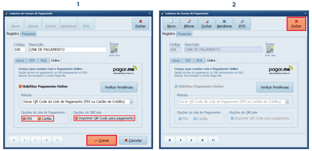 19- Em Opções do Link de Pagamento, você poderá escolher manter ativos os parâmetros PIX e Cartão como formas disponíveis para o cliente realizar o pagamento. Em Opções do QR Code, se desejar, selecione a opção Imprimir QR Code para pagamento. Logo após, clique em Gravar > Fechar.