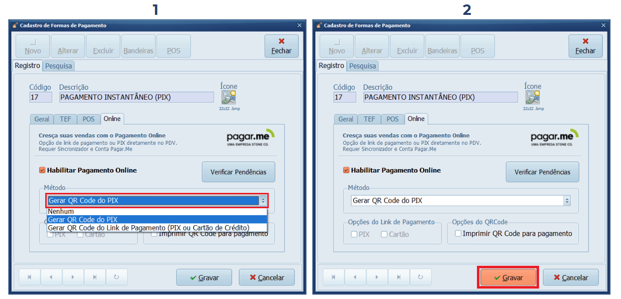 5- Em Método, selecione a opção Gerar QR Code do PIX > Gravar.