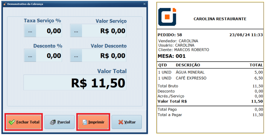 21- Se desejar, clique em Imprimir para entregar ao cliente os detalhes da cobrança. Logo após, clique em Fechar Total.