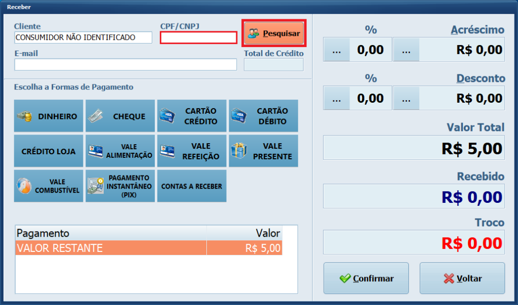 9- Digite o CPF/CNPJ do cliente ou clique em Pesquisar para selecionar o cadastro.