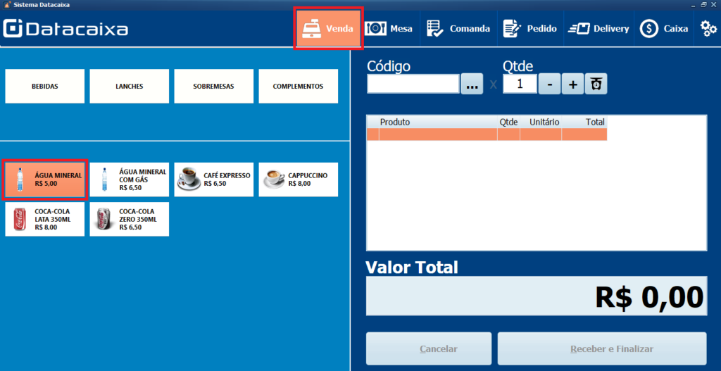 7- Acesse o módulo Venda e selecione os produtos que desejar.