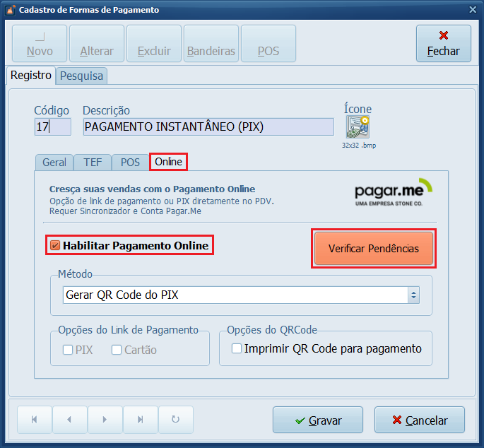 3- Na aba Online, selecione o parâmetro Habilitar Pagamento Online. Logo após, clique em Verificar Pendências.