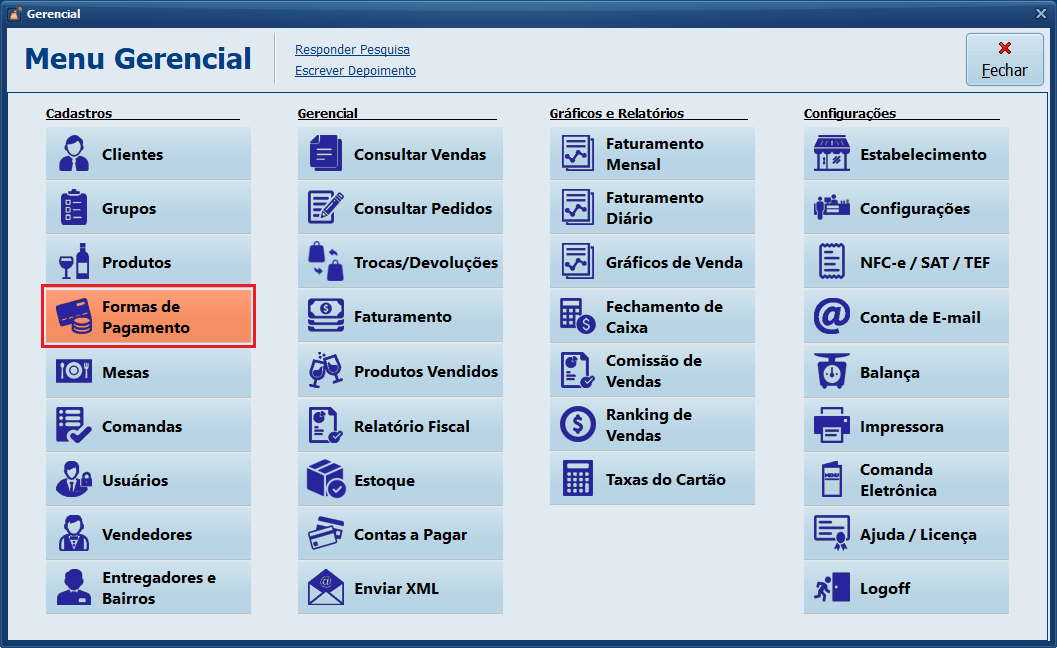 16- Acesse o Menu Gerencial > Forma de Pagamento.