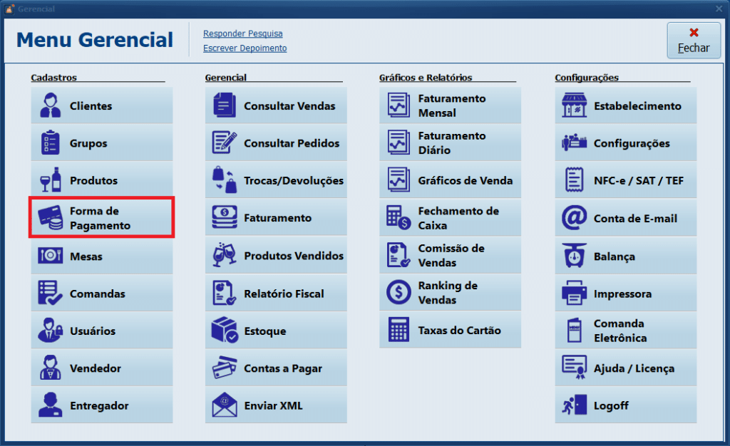 1- Acesse o Menu Gerencial > Forma de Pagamento.