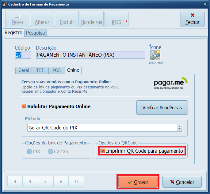 3- Com o Pagamento Online já habilitado, selecione o parâmetro Imprimir QR Code para pagamento > Gravar.