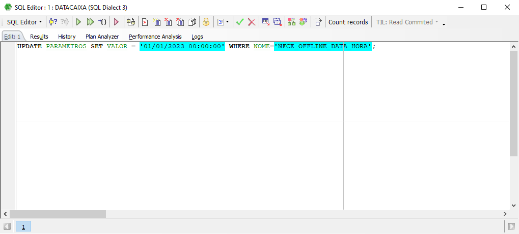 UPDATE PARAMETROS SET VALOR = ’01/01/2023 00:00:00′ WHERE NOME=’NFCE_OFFLINE_DATA_HORA’;