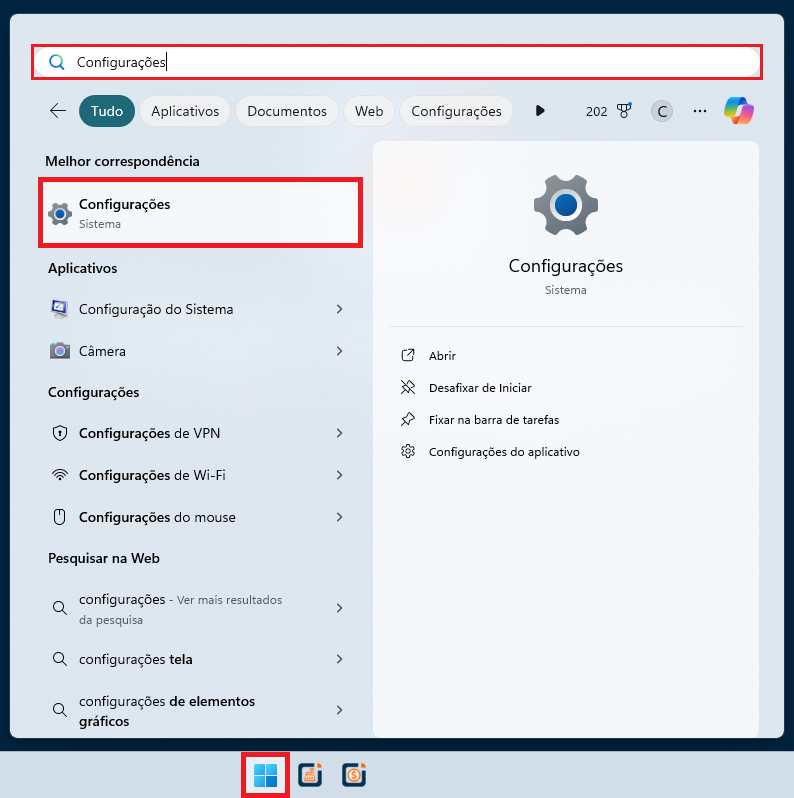 1- Abra o menu Iniciar > Configurações.