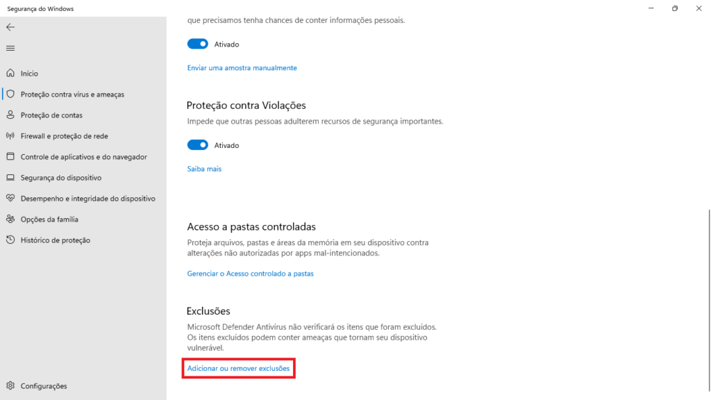 5- No final da página, na seção Exclusões, clique em Adicionar ou remover exclusões.