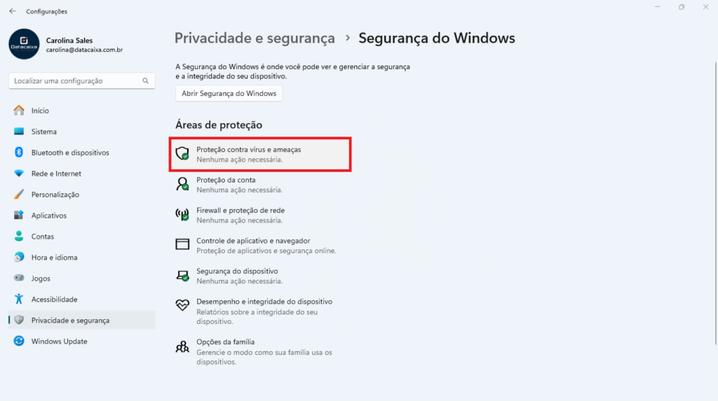 3- Clique em Proteção contra vírus e ameaças.