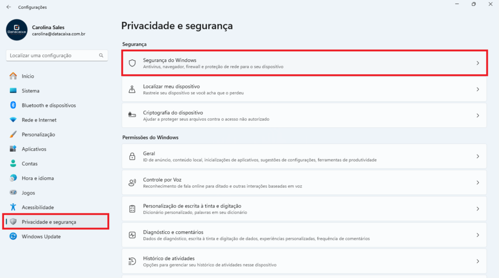 2- Em Privacidade e segurança, clique em Segurança do Windows.