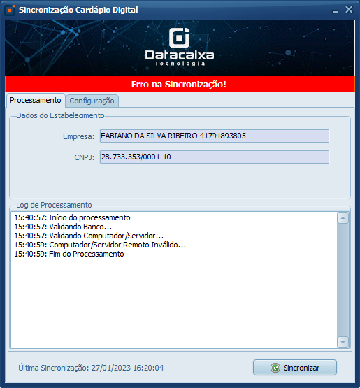 Solução: O processo de sincronização precisa ser realizado no computador Servidor, caso esteja realizando em um computador Estação finalize o processo e inicie novamente no Servidor, se persistir atualize a versão do Sistema. Se mesmo assim não normalizar, entre em contato com nosso departamento de Suporte imediatamente que teremos o prazer em lhe ajudar no WhatsApp (11) 98620-5451.