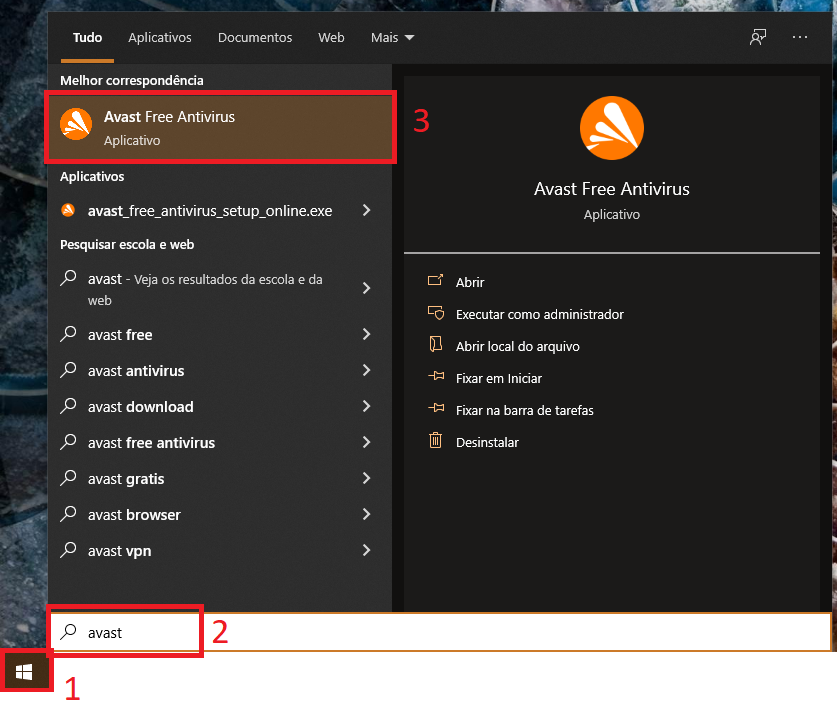 1- Pesquise por Avast na barra de pesquisa do Windows e clique Avast (sua versão do antivírus, no caso deste exemplo Free Antivirus).