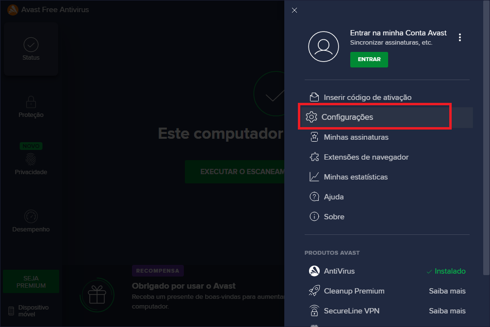 3- Clique em Configurações.