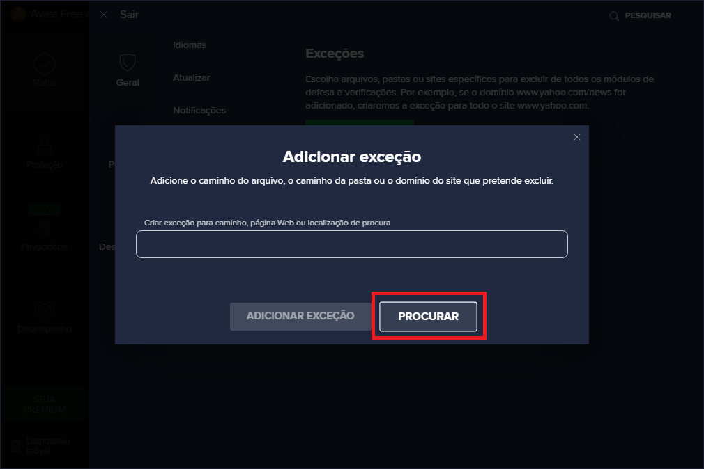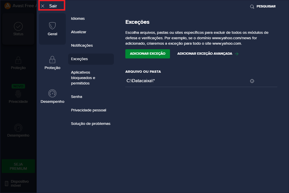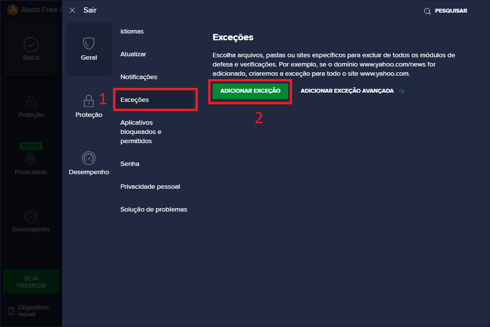 4- Clique em Exceções, depois em Adicionar Exceção.