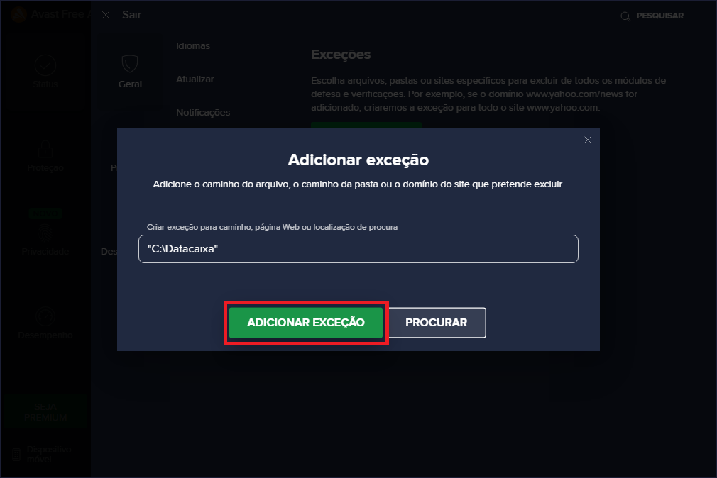7- Clique em Adicionar Exceção.
