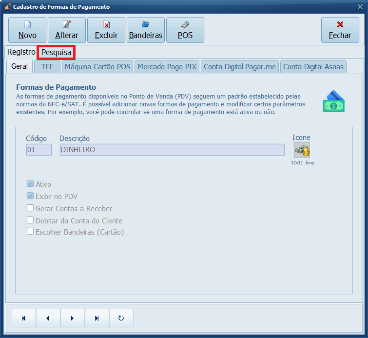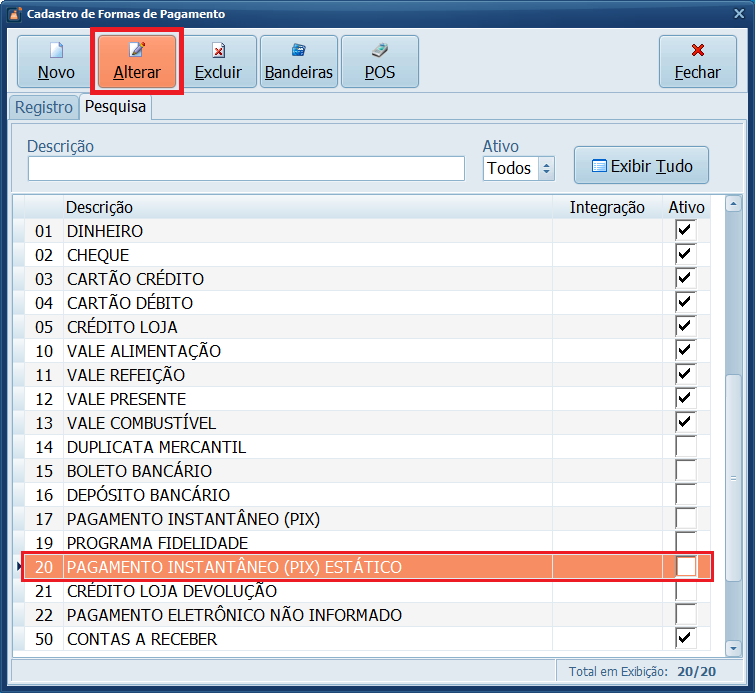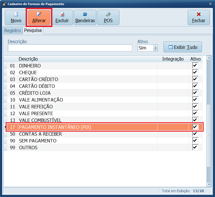 Iremos desabilitar o PIX (código 17) para evitar que ele seja selecionado indevidamente durante a finalização da venda. Em seguida, será habilitado o PIX Estático (código 20).