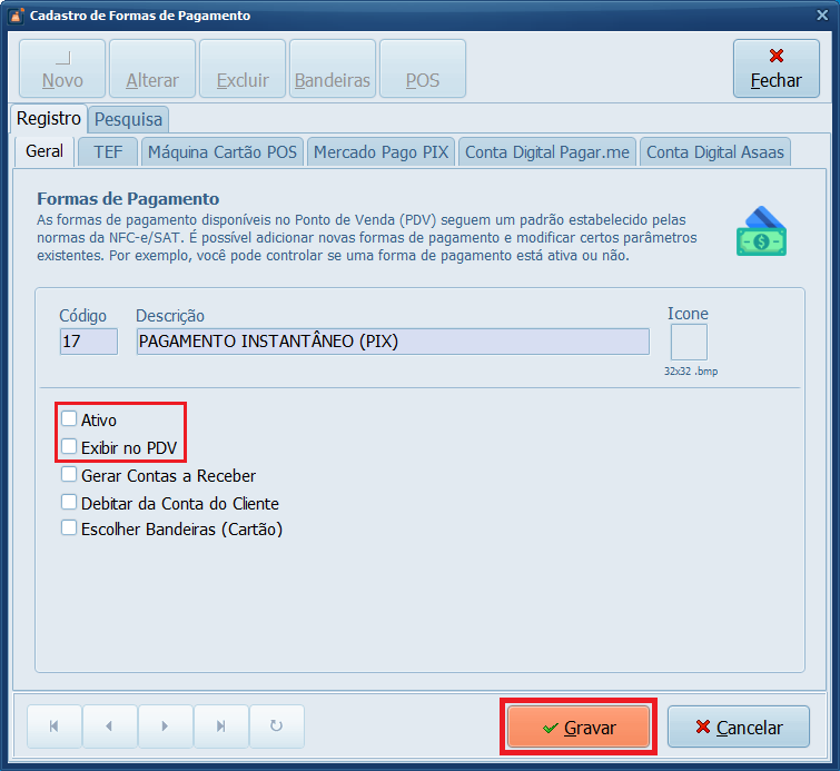 8- Marque as opções Ativo e Exibir no PDV, depois clique em Gravar.