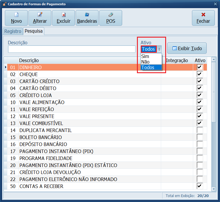6- Em Ativo, selecione a opção Todos para visualizar todas as Formas de Pagamento disponíveis.