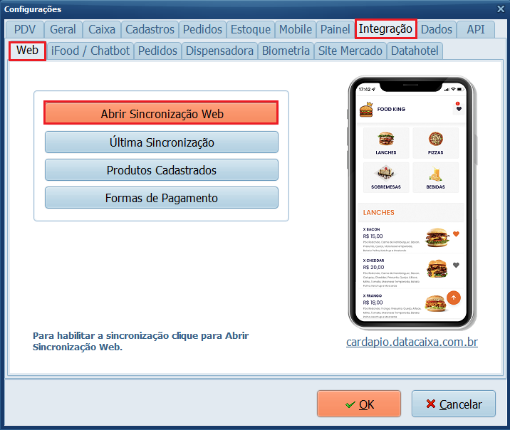 2- Na aba Integração > Web, clique em Abrir Sincronização Web.