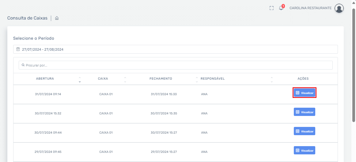 Nesta etapa, você visualizará a lista de caixas que foram abertos para que você possa visualizar mais detalhes das operações de caixa do seu PDV.