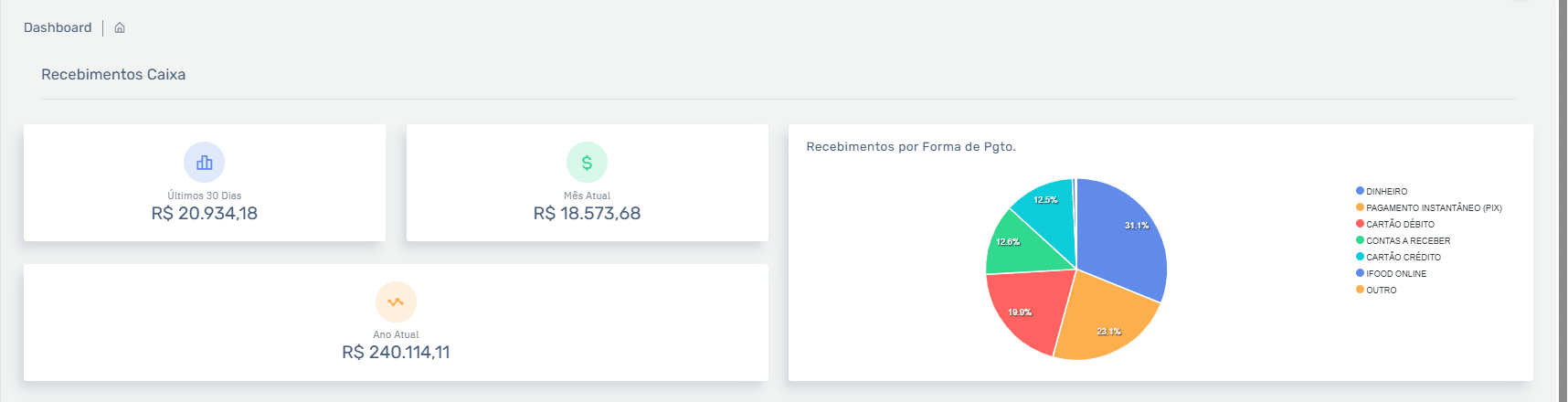 9- Em Dashboard, você poderá conferir as principais informações de Recebimentos do Caixa, incluindo: