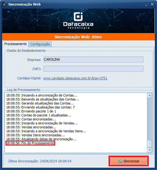 5- Na aba Processamento, clique em Sincronizar e aguarde até o fim da sincronização.