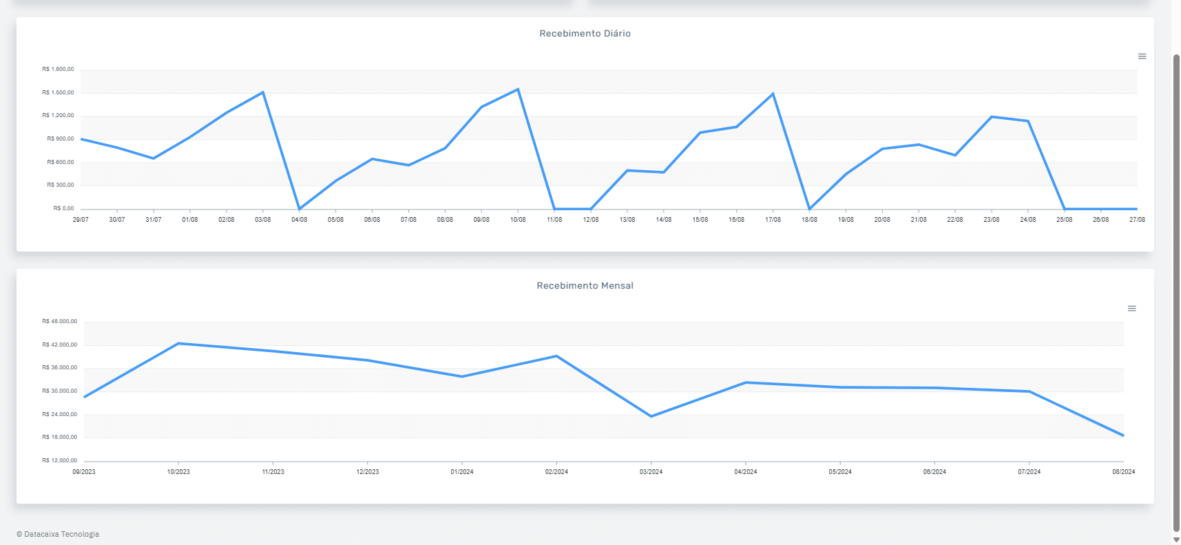 - Gráficos sobre Recebimento Diário: Detalha os recebimentos diários, mostrando o fluxo de vendas ao longo da semana.