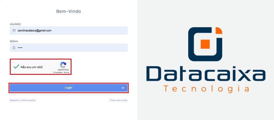 7- No campo Usuário, insira seu e-mail cadastrado. Em seguida, digite sua senha no campo correspondente. Marque a caixa Não sou um robô e clique em Login.